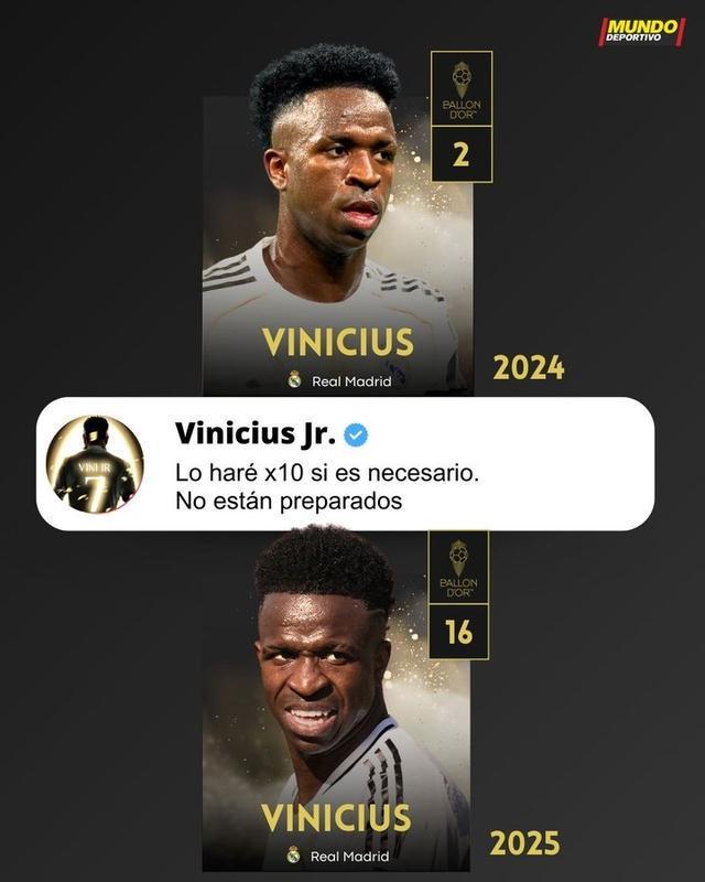 西班牙媒体《世界体育报》晒出维尼修斯在去年金球奖颁奖典礼后的言论:如果有必要我会付出10倍努力,他们还没准备好。