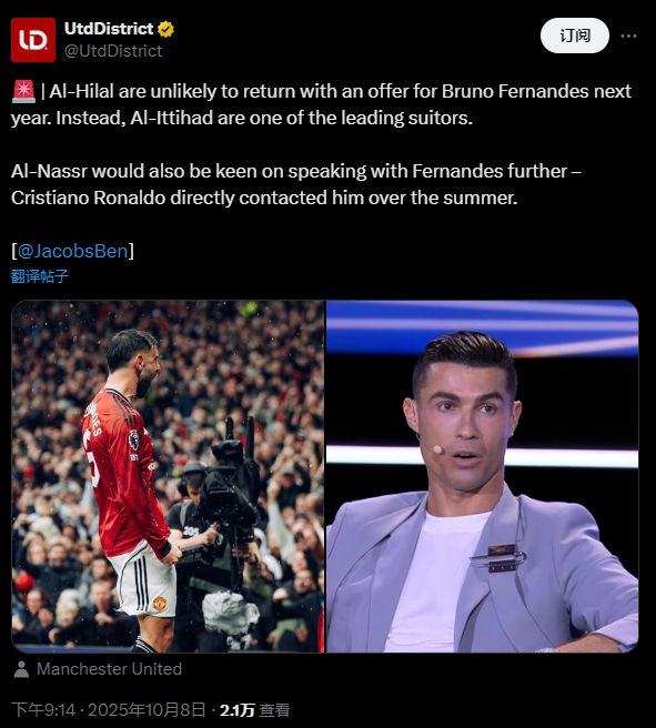 据talkSPORT电台记者Ben Jacobs透露,尽管今年夏天遭到了B费的拒绝,但利雅得胜利一直在关注着B费的动向。甚至C罗已经直接与这位同胞通话,讨论了在利雅得相聚的可能性。过去3个赛季,C罗一直在沙特踢球,他在今年夏天就与B费关于转会事宜有过交流。