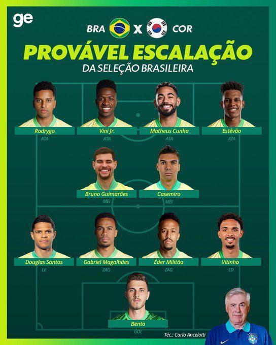 北京时间10月10日19:00,韩国对阵巴西的友谊赛在首尔世界杯竞技场打响。桑巴军团公布首发,维尼修斯、罗德里戈、库尼亚和埃斯特旺组成攻击线,熊皇预计更多靠近球门,胖虎、吉马搭档中场。 巴西阵容(424):本托/维蒂尼奥、米利唐、加布里埃尔·马加良斯、道格拉斯·桑托斯/卡塞米罗、吉马良斯/埃斯特旺、库尼亚、维尼修斯、罗德里戈